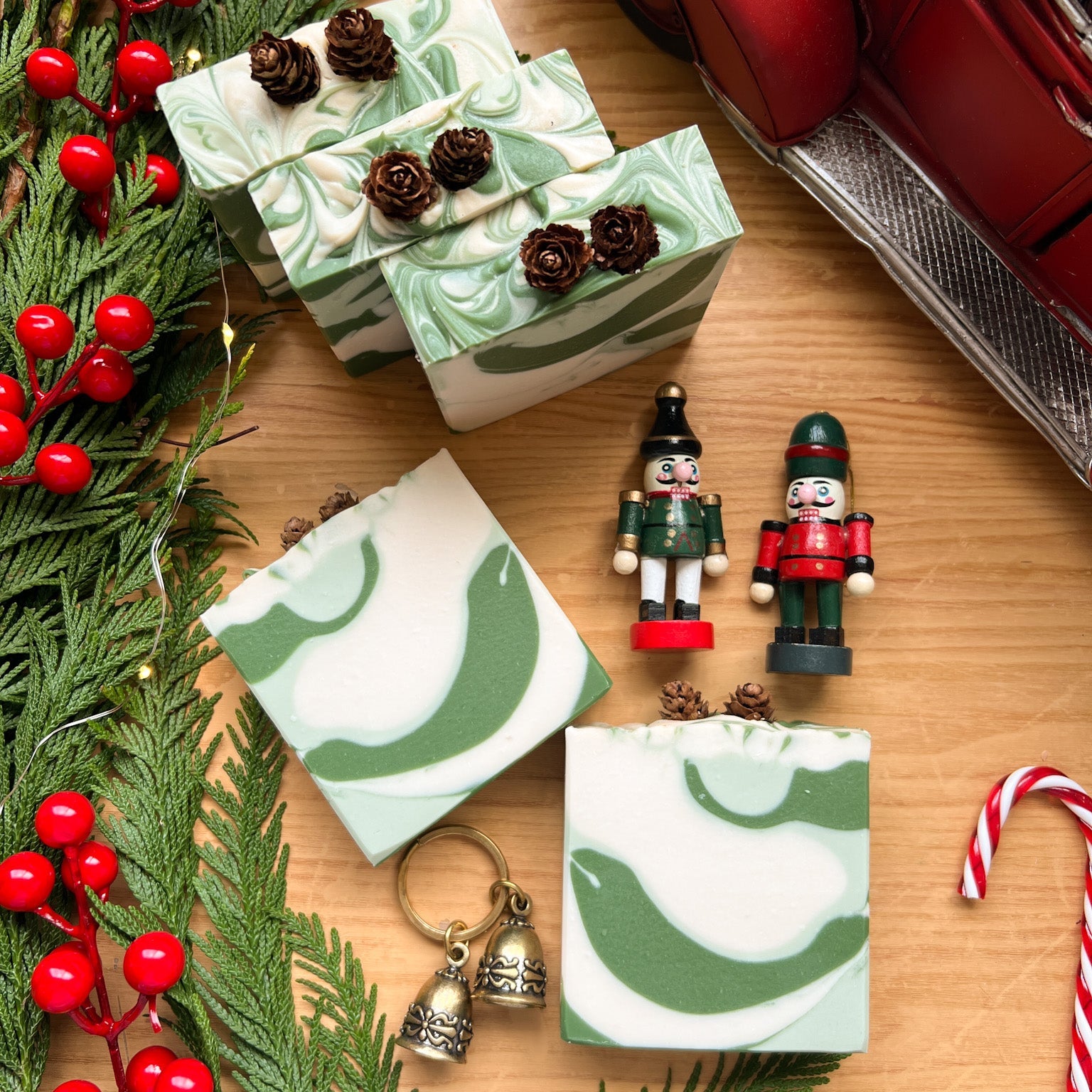 Cada barra contiene en la parte superior una mini piña de pino natural, que añade un detalle auténtico y festivo, resaltando su encanto artesanal.